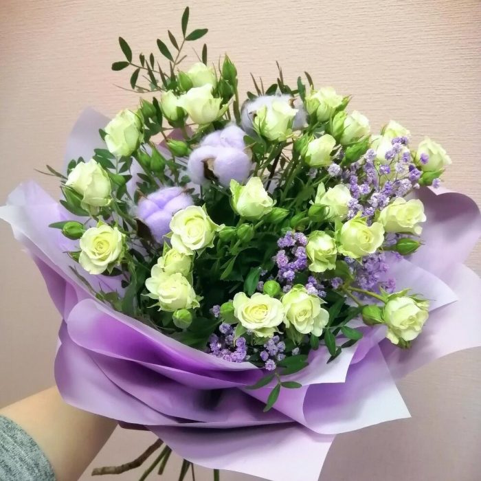 Роза кустовая – 5 шт.Гипсофила – 1 шт.Хлопок натуральный – 3 шт.Фисташка – 2 шт.Упаковка – 1 шт.