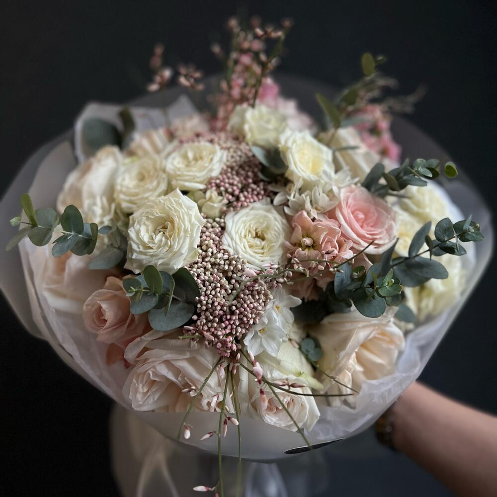 Пионовидная роза – 7 шт.Кустовая роза – 5 шт.Одноголовая роза – 3 шт.Гениста – 2 шт.Озотамнус – 2 шт.Маттиола – 3 шт.нарциссов – 5 шт.Эвкалипт – 5 шт.декоративная упаковка – 1 шт.Атласная лента – 1 шт.