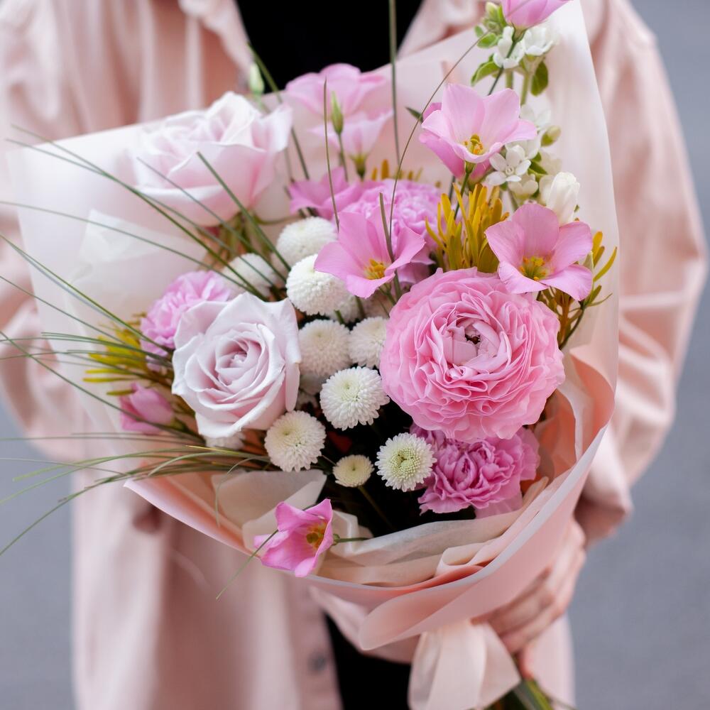 лизиантус ботаника – 1 шт.Ранункулюс – 1 шт.Роза – 2 шт.Диантус – 3 шт.Хризантема кустовая – 2 шт.Берграсс – 20 шт.каапс микс – 2 шт.Оксипеталум – 2 шт.Упаковка дизайнерская – 1 шт.