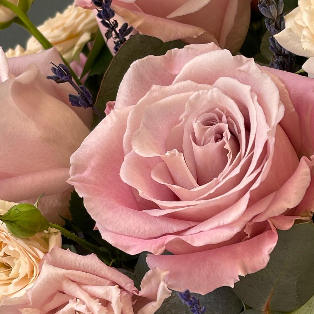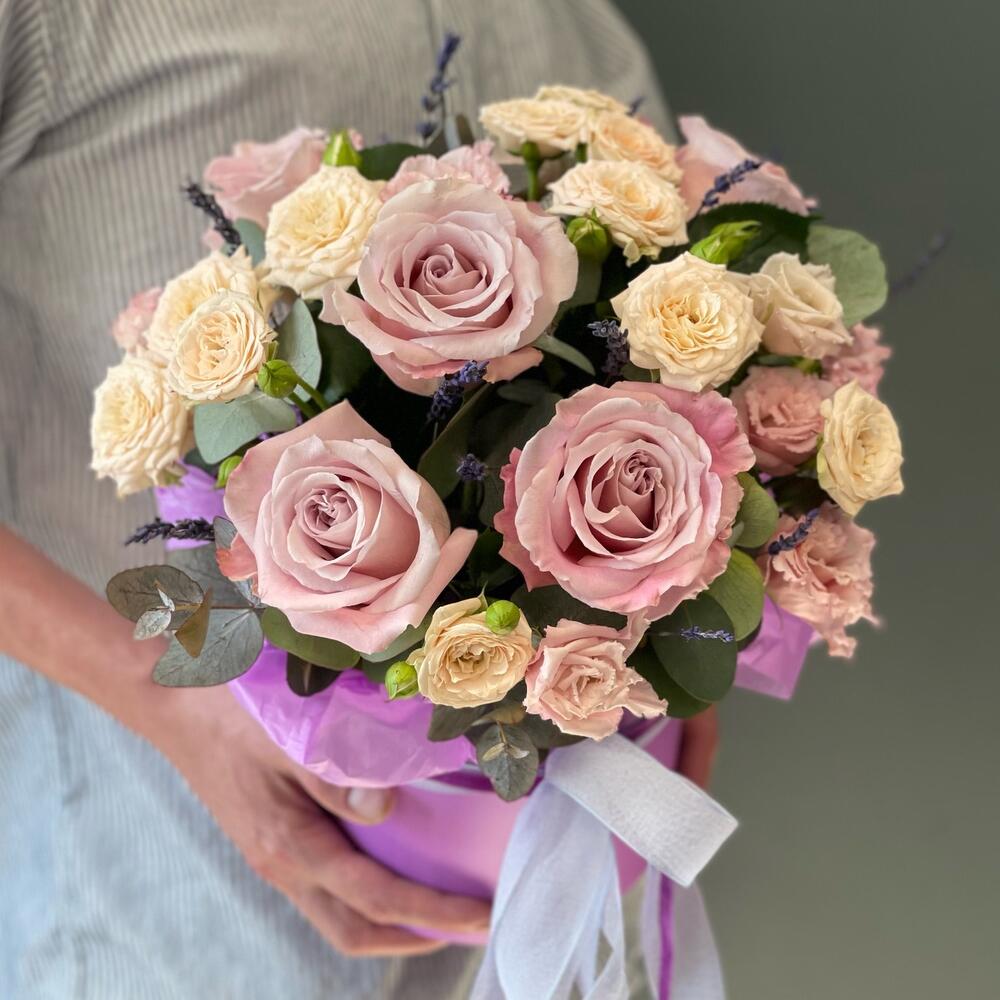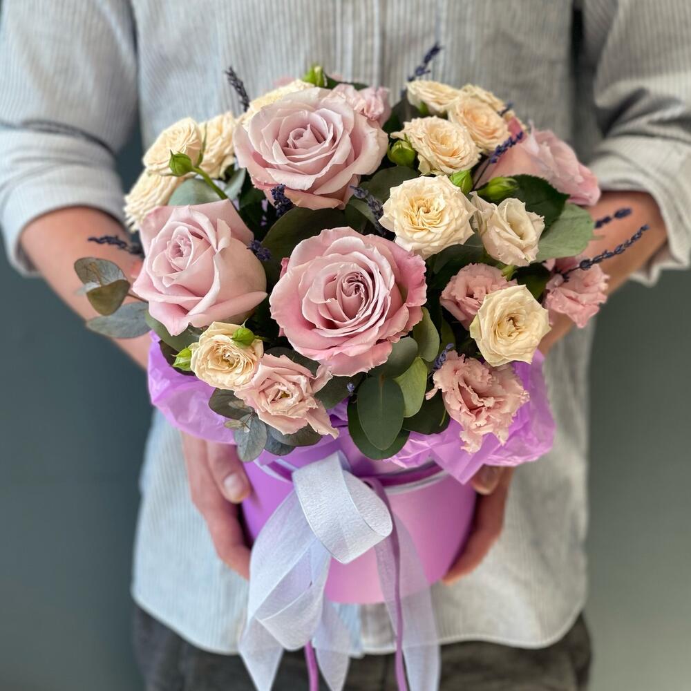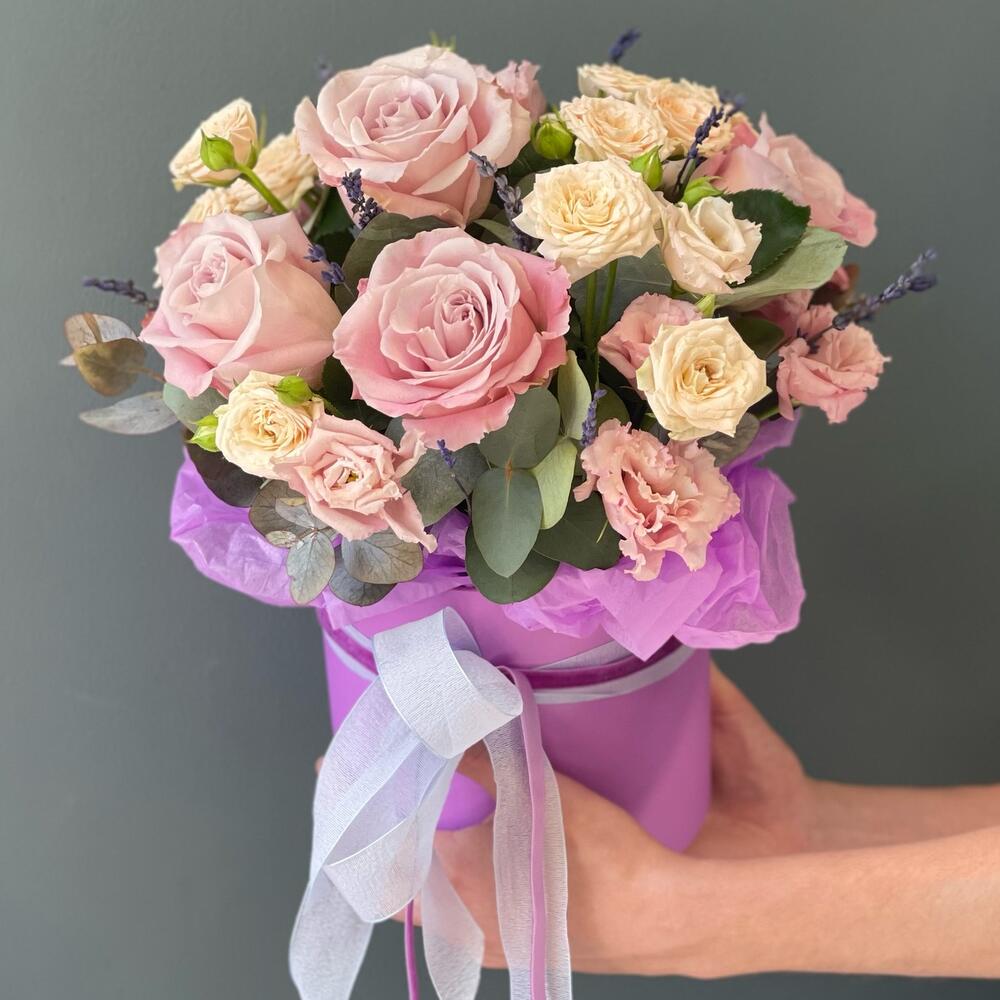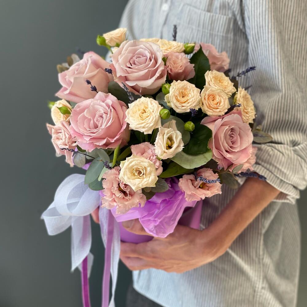 Лаванда (сухоцвет) – 11 шт.Лизиантус – 2 шт.Роза кустовая – 2 шт.Эвкалипт – 2 шт.Роза – 5 шт.Лента атласная – 1 шт.Тишью – 1 шт.Коробка шляпная – 1 шт.Оазис флористический – 1 шт.