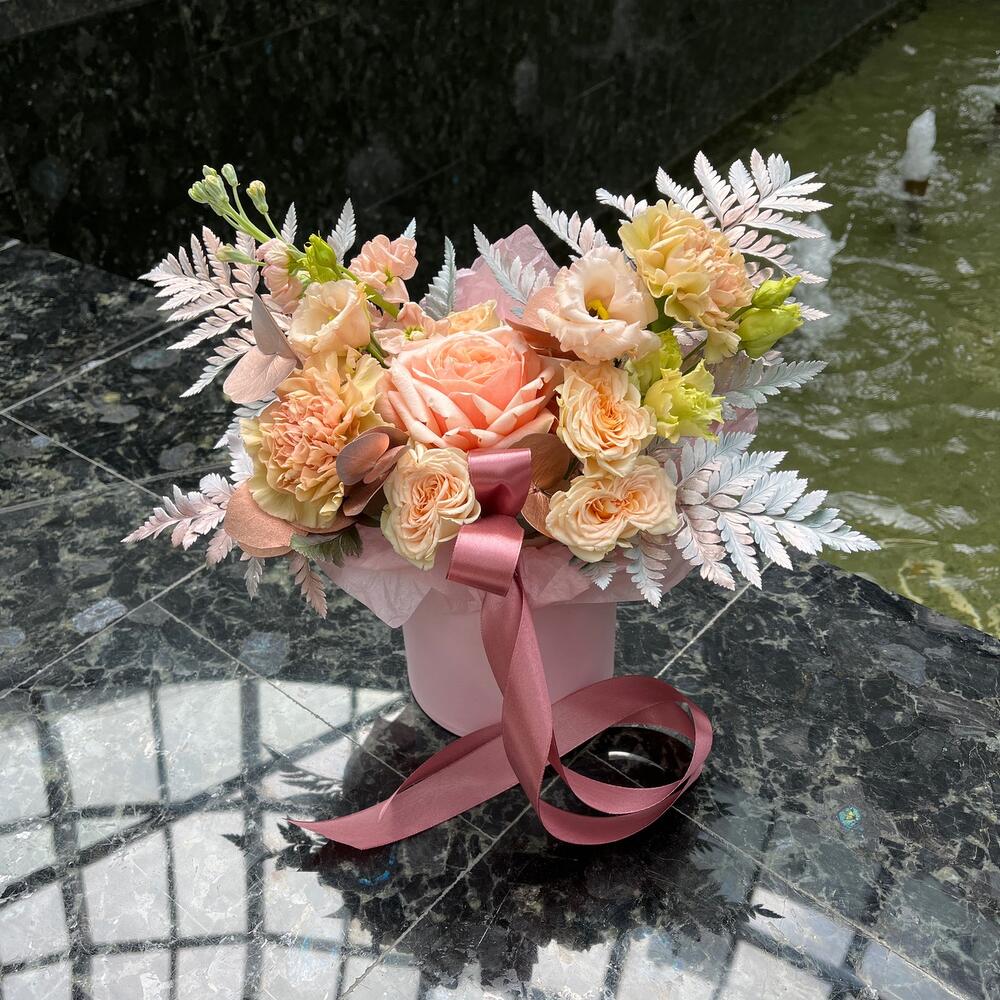 Роза – 1 шт.Роза кустовая – 1 шт.Лизиантус – 1 шт.Диантус – 2 шт.Маттиола – 1 шт.Эвкалипт – 1 шт.Папоротник – 3 шт.Лента – 2 шт.Коробка шляпная – 1 шт.