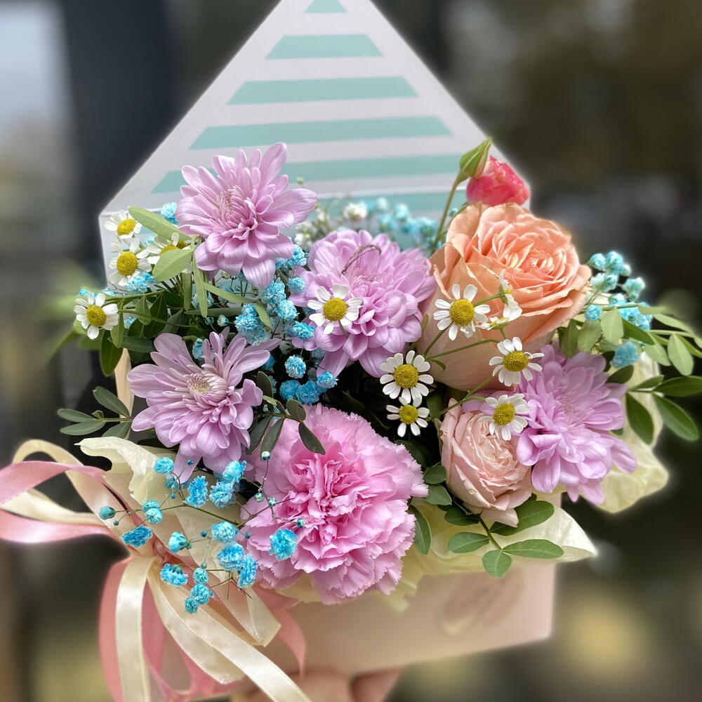 Хризантема кустовая – 1 шт. Зелень – 1 шт. Диантус – 1 шт. Роза – 1 шт. Роза кустовая пионовидная – 1 шт. Танацетум – 1 шт. конверт картонный – 1 шт.