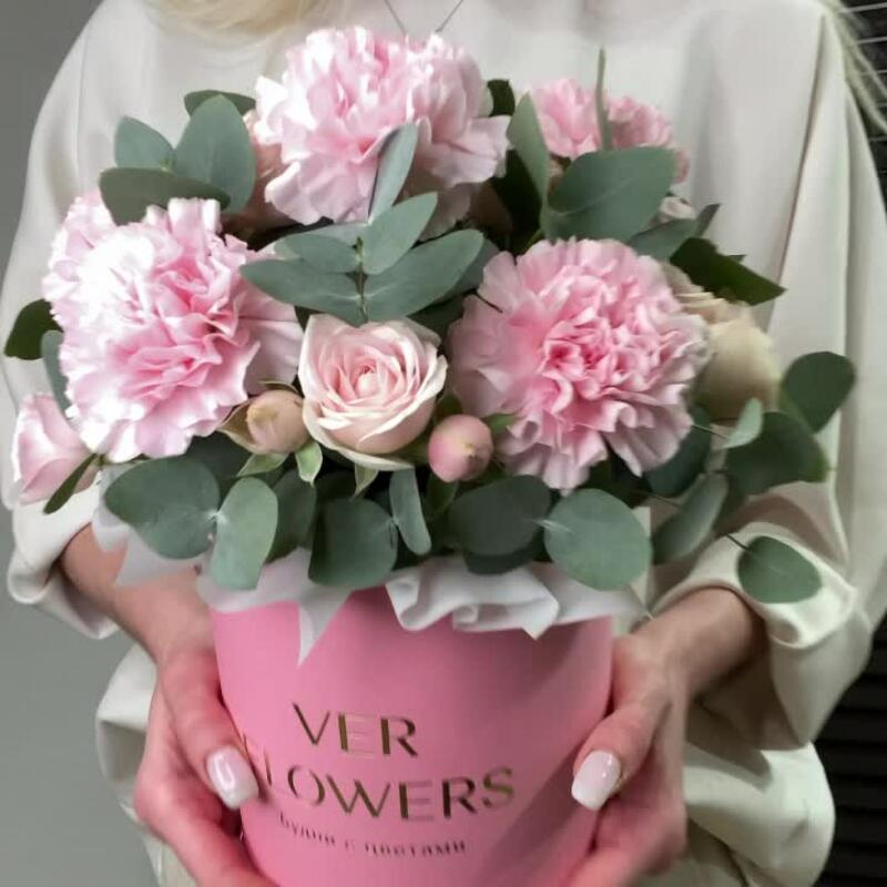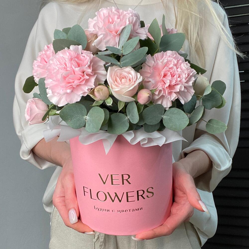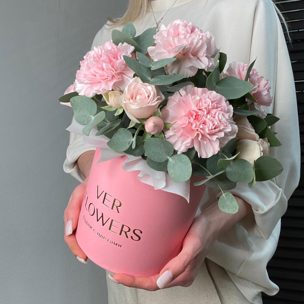 Диантусы с кустовыми розами в коробке