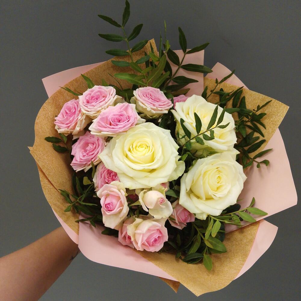 Роза аваланж 70 см – 3 шт.Роза кустовая – 3 шт.упаковка авторская – 2 шт.