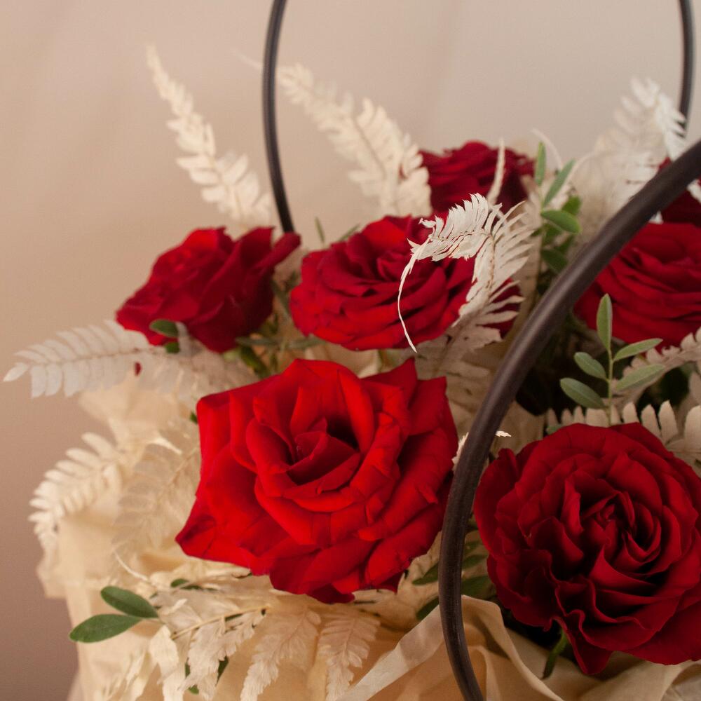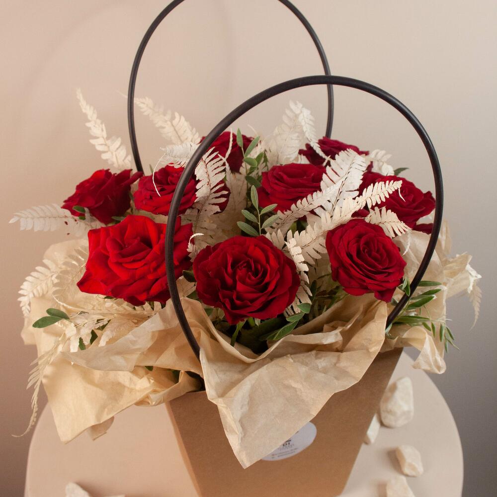 Роза красная – 9 шт. Зелень – 1 шт. Сумка – 1 шт.