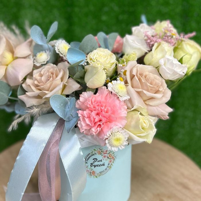 Роза кустовая – 2 шт.Эвкалипт – 6 шт.Ромашка – 1 шт.Эустома – 2 шт.Диантус – 2 шт.Коробка шляпная – 1 шт.Сухоцветы – 2 шт.Роза Мента – 3 шт.Губка флористическая – 1 шт.
