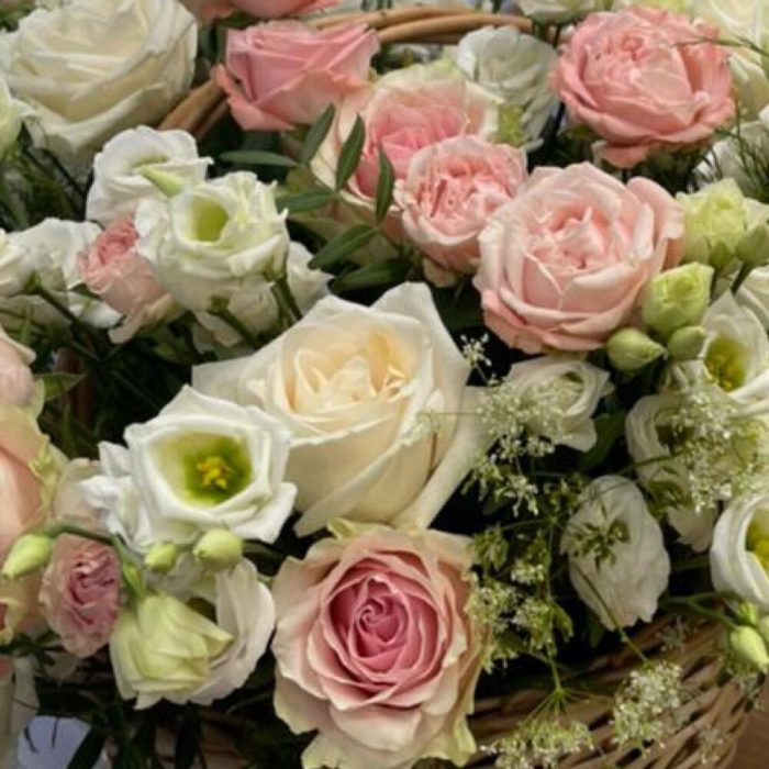 Роза Эквадор – 17 шт.Лента атласная – 2 шт.Фисташка – 7 шт.Корзина плетеная – 1 шт.Оазис флористический – 2 шт.эустома белая – 10 шт.Кустовая роза пионовидная – 10 шт.