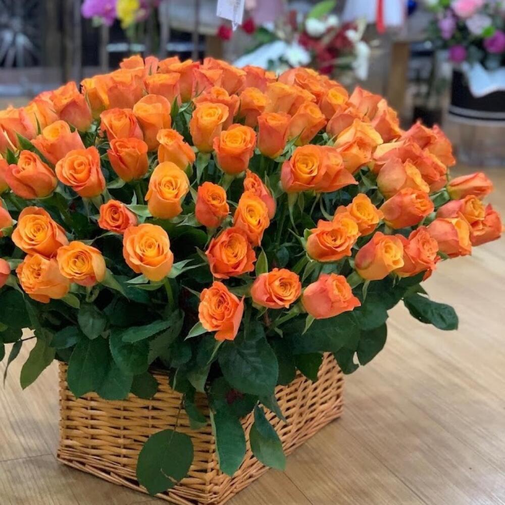 Роза оранжевая – 101 шт.Корзина плетеная – 1 шт.Лента атласная – 1 шт.Открытка – 1 шт.хорошее настроение – 100 шт.инструкция по уходу за цветами – 1 шт.Кризал – 1 шт.