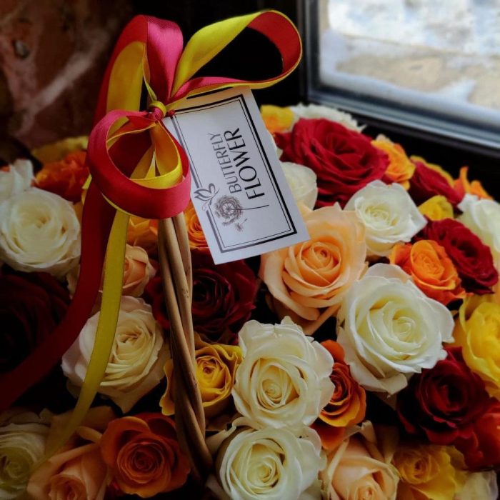 Метки: 101 роза, от 5000 руб, цветы в корзине