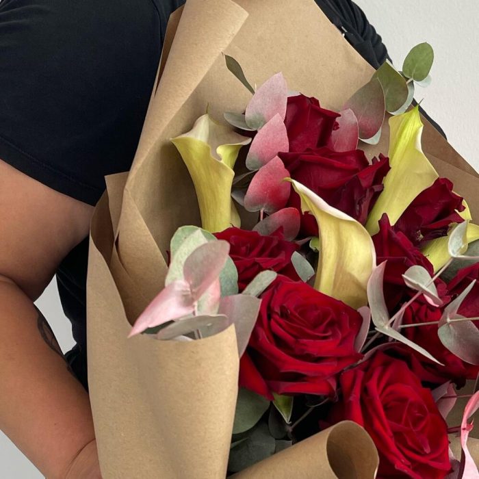 Роза красная – 9 шт.Лента атласная – 1 шт.Калла белая – 4 шт.Крафт упаковка – 3 шт.