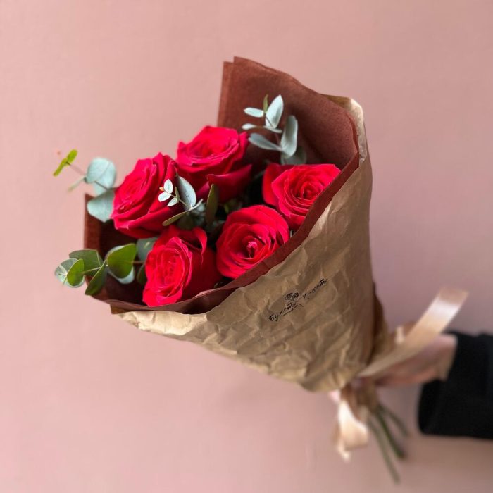 Лента – 1 шт.Эвкалипт – 1 шт.Тишью – 1 шт.Крафт – 1 шт.Красная роза – 5 шт.