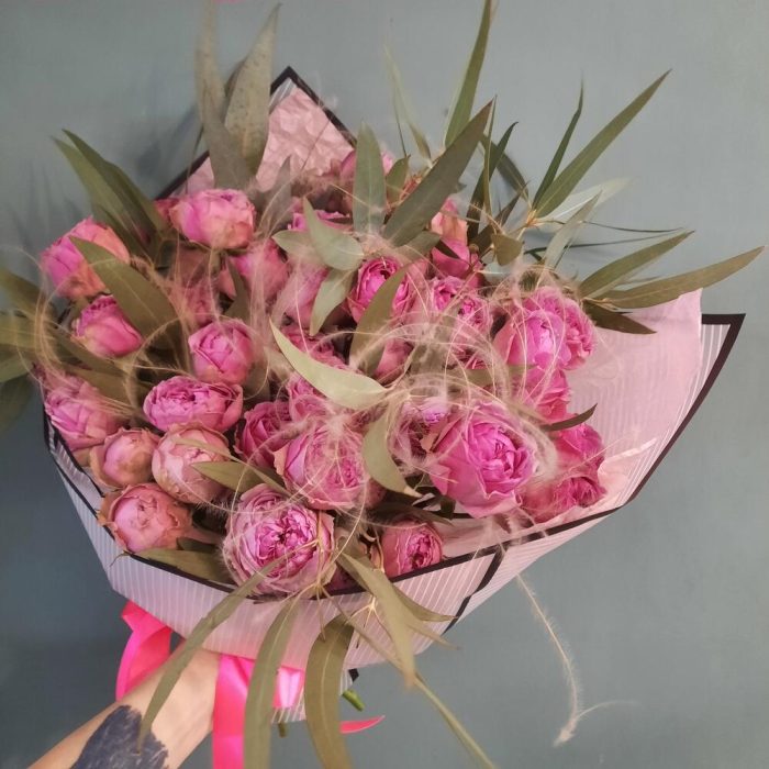 роза мисти бабл пионовидная – 17 шт.Эвкалипт – 5 шт.Ковыль – 5 шт.Упаковка дизайнерская – 1 шт.