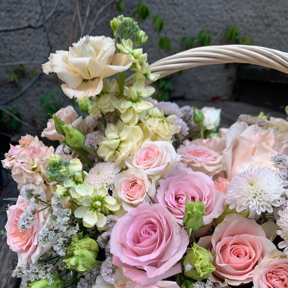 Лизиантус – 2 шт.Маттиола – 5 шт.Роза кустовая – 3 шт.Хризантема кустовая – 4 шт.Роза – 9 шт.Диантус – 5 шт.Корзина плетеная – 1 шт.Флористическая губка (оазис) – 1 шт.зелень декоративная – 3 шт.