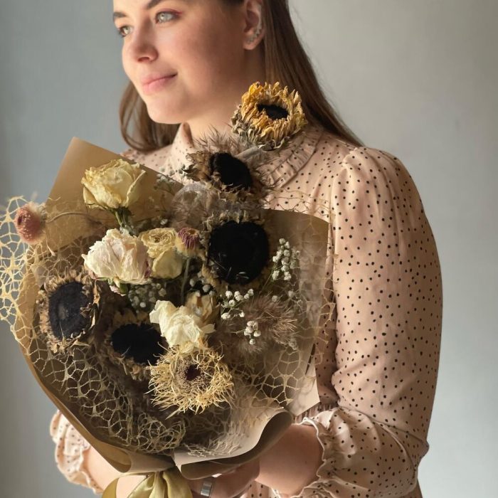 Подсолнух – 5 шт.Роза – 5 шт.Гербера – 3 шт.камыш декоративный – 3 шт.Пленка дизайнерская – 2 шт.Органза – 1 шт.Лента атласная – 1 шт.