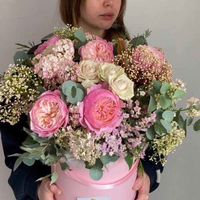 Садовая композиция в шляпной коробке с пионовидными розами, сиренью, ваксфлауэром, фатинией и эвкалиптом.