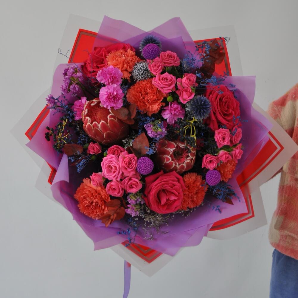 Очень яркий!Необычное сочетание экзотики и классики – протея, колючки, розы и гвоздики.Необычный букет для вашего получателя!Станет прекрасным подарком на день рождения, юбилей. Яркие краски как никогда лучше подходят для дарения в это время года)