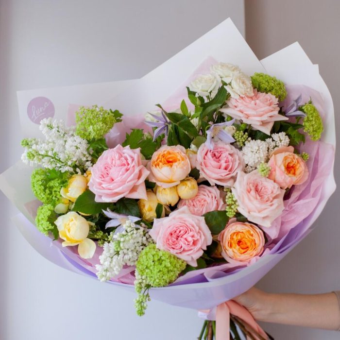 Пышный весенний букет с сиренью и пионовидными розами