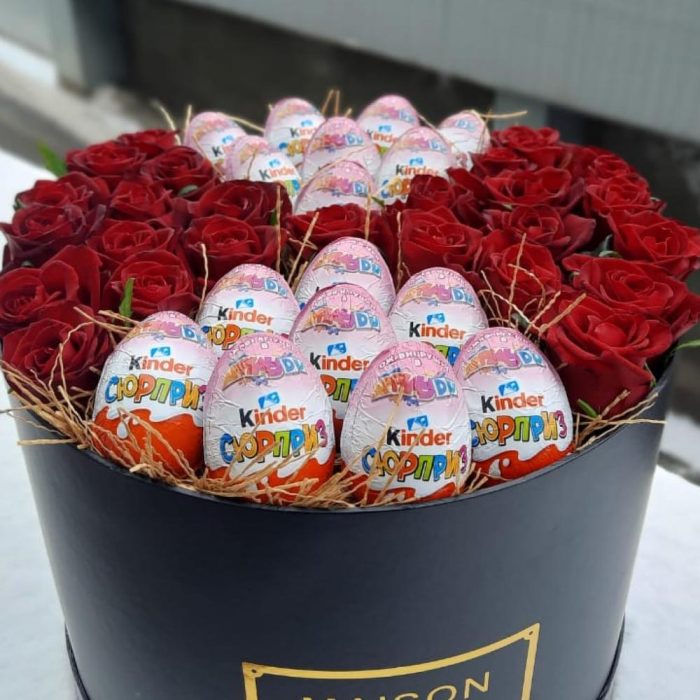 Роза красная – 25 шт. Киндер сюрприз – 16 шт. Коробка черная – 1 шт.