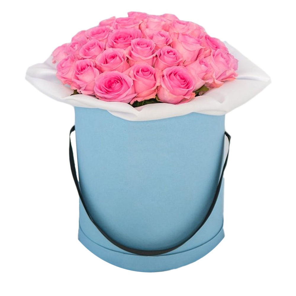 шляпная коробка 25*25 см – 1 шт.Аквабокс – 1 шт.Роза розовая – 51 шт.