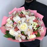 Орхидея Цимбидиум – 11 шт.Альстромерия – 7 шт.Роза – 7 шт.Хризантема кустовая – 3 шт.Зелень – 15 шт.Упаковка – 1 шт.