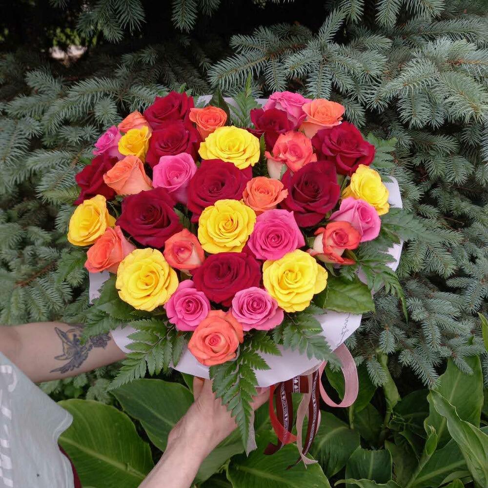 Роза разноцветная – 35 шт. форма сердца – 1 шт. Лента – 1 шт.