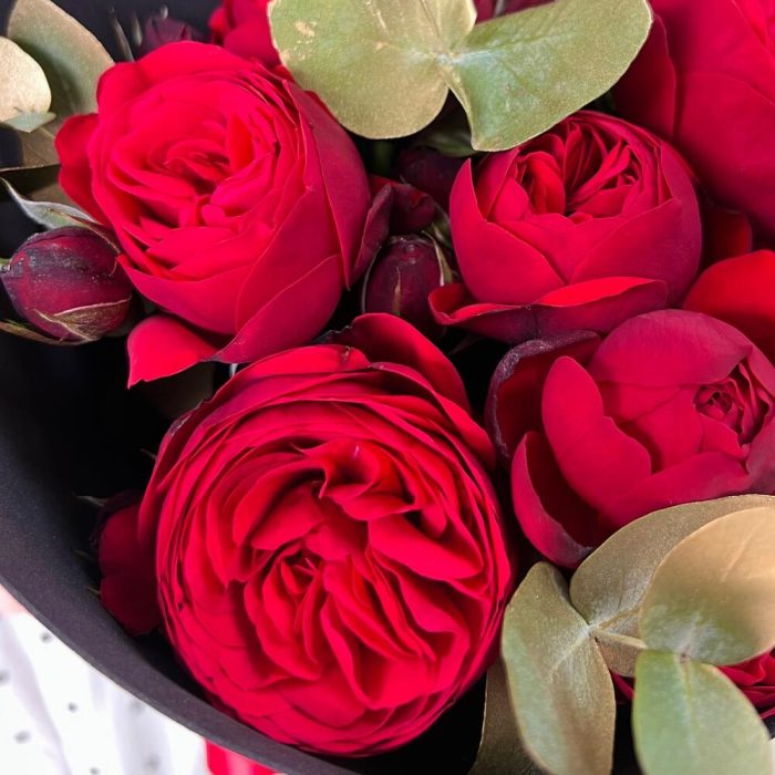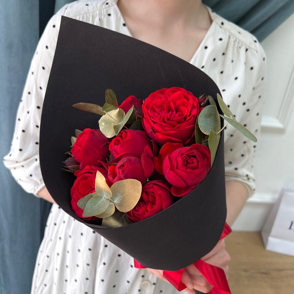 роза пионовидная ред пиана – 7 шт.Эвкалипт – 3 шт.Дизайнерская упаковка – 1 шт.Лента атласная – 1 шт.подкормка для срезанных цветов – 1 шт.рекомендация по уходу за цветами – 1 шт.
