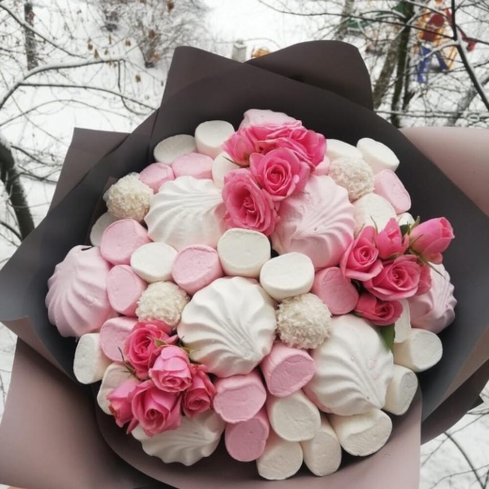 Удивительный букет для самых любимых, талантливых и кого так хочется побаловать.Сладкая композиция из зефира, маршмеллоу, макрони, рафаэлло и цветов, станет красивым подарком на день рождения, семейный повод.Если вы далеко, но очень хочется сделать сюрприз, закажите у нас букет, а курьер вручит его в назначенное время вашему любимому человеку.Букет – важный компонент подарка.Кроме цветочных традиционных букетов, сегодня привлекают внимание продуктовые и сладкие букеты. Они играют роль самостоятельного сюрприза, а могут быть оригинальным дополнением к основному подарку.Такие оригинальные букеты очень обрадуют не только малышей и женскую половину человечества, они не оставят равнодушными и мужчин. Тем более среди них – немало откровенных сладкоежек.Ещё больше работ вы найдёте в нашем профиле.Наши опытные флористы, с огромными удовольствием соберут букет Вашей мечты, учитывая Ваши пожелания)