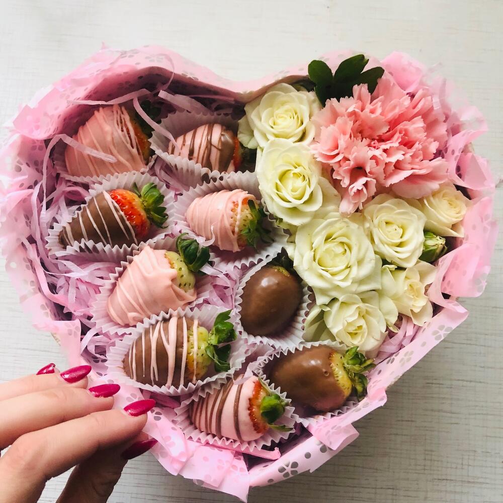 “Сладкое сердце ” – цветочная композиция с сладостями в коробке “Сердце”