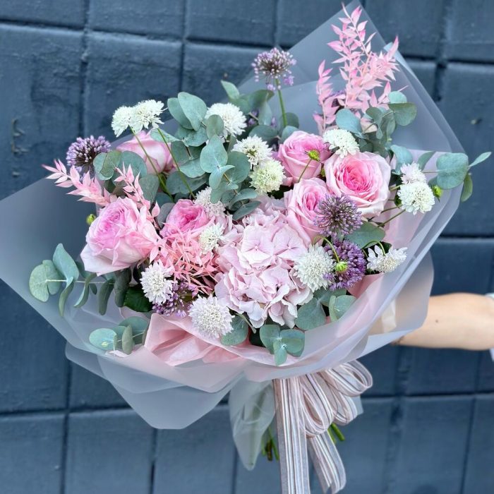 Альстромерии, Гвоздики, Кустовые розы, Лизиантусы, Розы, Хризантемы