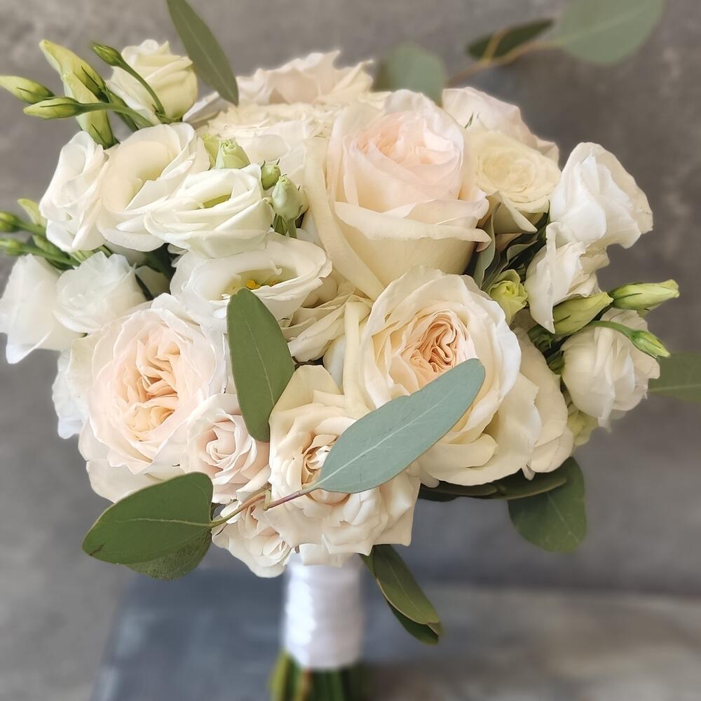 Лизиантус – 5 шт.Роза кустовая – 5 шт.Эвкалипт – 2 шт.Роза одноголовая – 5 шт.Лента атласная – 1 шт.