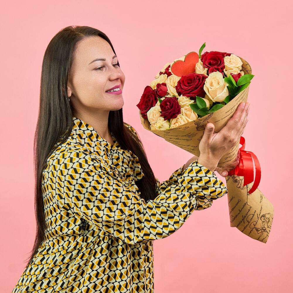 Салал – 1 шт.бумага крафт – 1 шт.лента атласная (красный) – 1 шт.Топпер сердце – 1 шт.роза кустовая красный – 3 шт.роза кустовая кремовый – 4 шт.роза одноголовая кремовый – 3 шт.роза одноголовая красный – 3 шт.