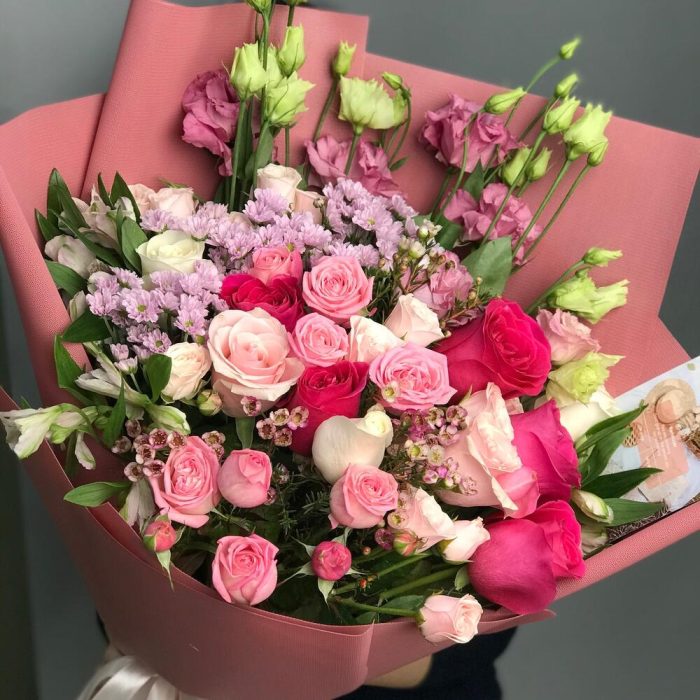 Альстромерии, Гвоздики, Кустовые розы, Лизиантусы, Розы, Хризантемы