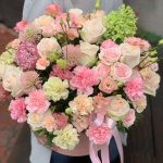 Роза кустовая – 5 шт.Лента атласная – 3 шт.Диантус – 23 шт.Коробка шляпная – 1 шт.Фисташка – 10 шт.Роза пионовидная – 11 шт.Диантус кустовой – 3 шт.Лизиантус розовый – 8 шт.Декоративные цветы – 5 шт.Оазис флористический – 3 шт.