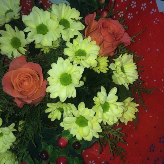 Роза – 3 шт.Хризантема кустовая – 3 шт.Гиперикум – 3 шт.Зелень – 15 шт.Упаковка – 1 шт.
