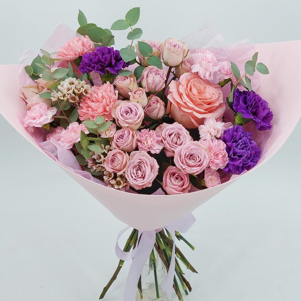 Нежный, ароматный, стильный букет в розово-сиреневых тонах. Такой букет всегда уместен и подойдёт для любого повода: День Рождения, именины, годовщина свадьбы, рождение ребенка, 8 марта, День Святого Валентина, выпускной и т.д. Можно вручить маме, сестре, подруге, коллеге, учителю, любимой.