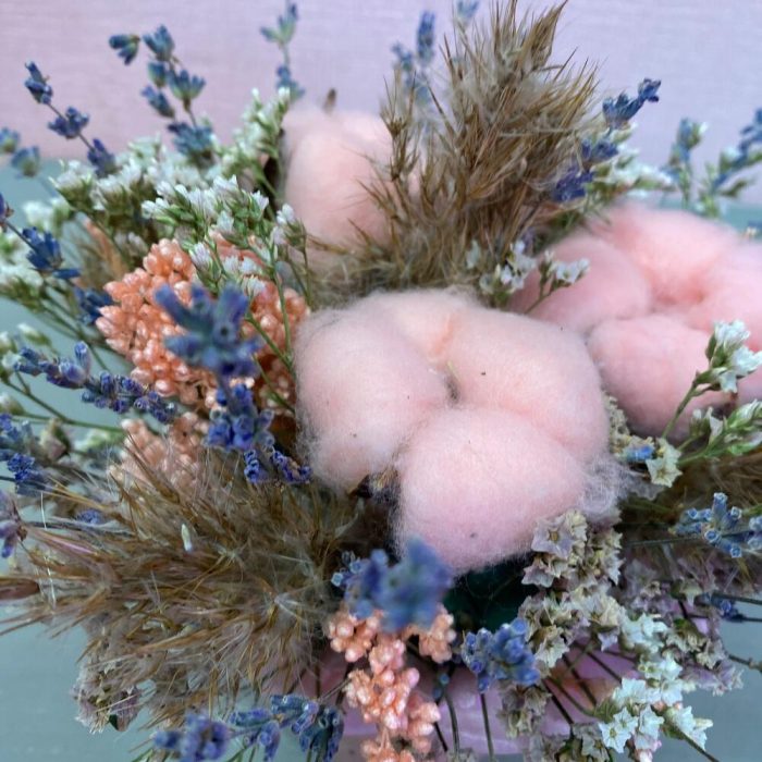 Хлопок натуральный – 3 шт.озотамнус розовый стабилизированный – 1 шт.лимониум стабилизированный – 1 шт.Ковыль – 1 шт.Лаванда (сухоцвет) – 30 шт.Оазис флористический – 1 шт.Кашпо керамическое – 1 шт.